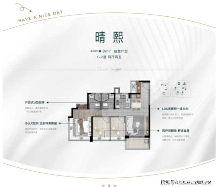 A:89㎡户型虽然是紧凑型产品,但卓越通过新规设计,做到了四房两卫,且主卧为套房设计。利用超大景观阳台与飘窗的可改造性,实际使用功能甚至优于市面上95‑100㎡的传统户型。对于预算有限或作为过渡型改善的家庭,这是一个极具性价比的选择。