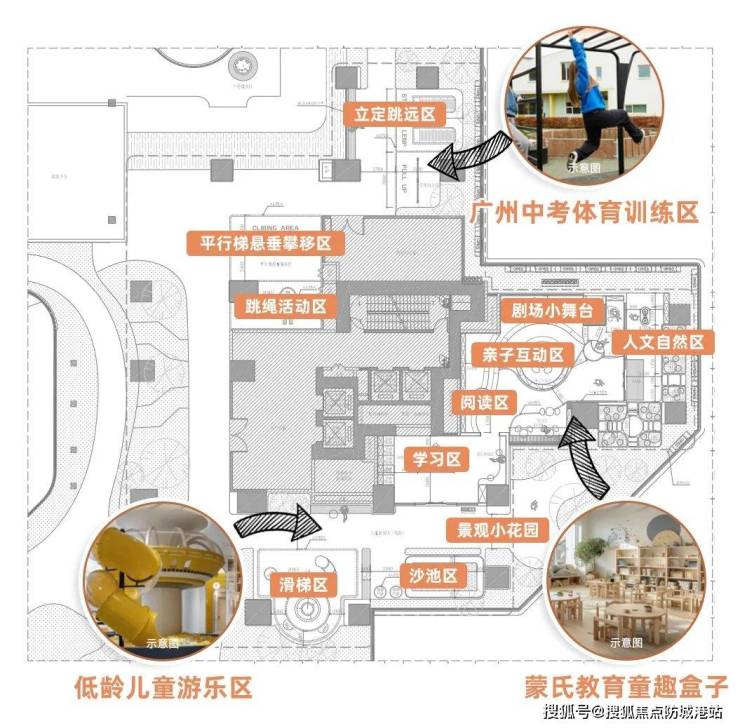 像是针对低龄孩子的攀爬玩乐区、童趣王国,为高年级儿童设置的中考体育训练区、植物科普区等等。更有供年长者休闲、活动的健身设施、棋盘、休闲卡座等户外活动区。