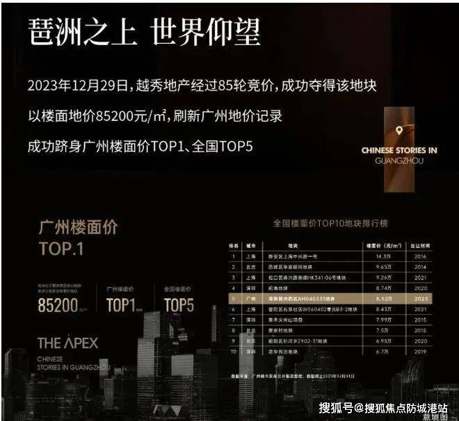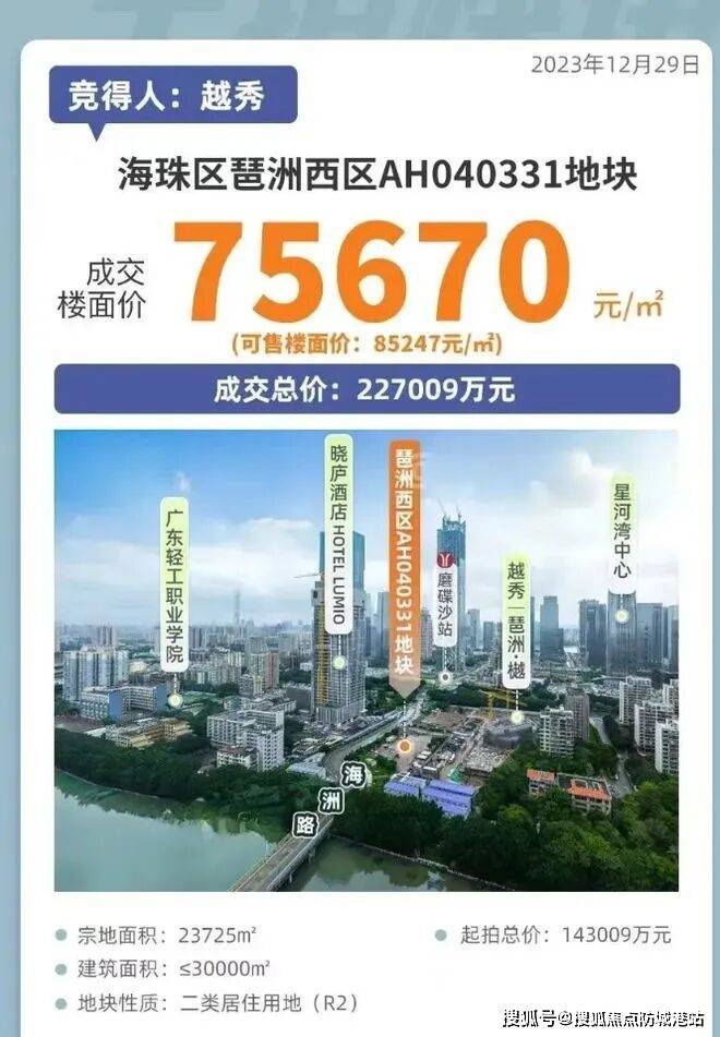 2026年2月25日,广州新春首场土拍迎来“开门红”,珠江新城马场地块经过8家企业、243轮、近9小时的激烈竞价,最终由越秀地产以236亿元竞得,成交总价位居广州历史第二,溢价率达26.6%,折合住宅楼面价约75746元/平方米,刷新广州史上最高楼面单价,超过琶洲的越秀华樾(75670元/㎡)。