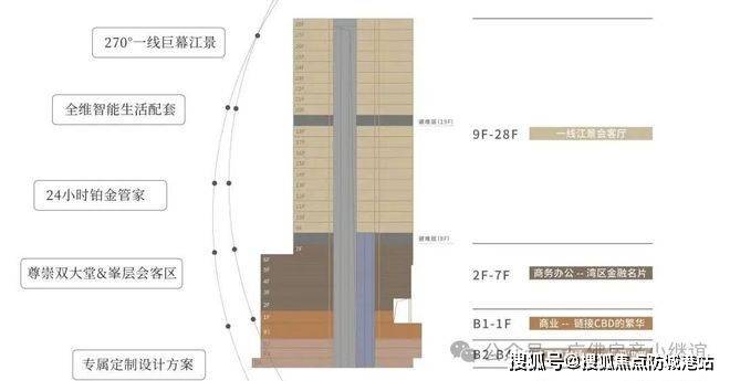 开发商广州城投作为市属国企,实力雄厚,项目整体定位高端,打造了一个集超甲级写字楼、江景住宅、特色商业于一体的综合体。建筑高度达到120米左右,规划了江景会客厅部分,主要集中在9到28层,总共只有96席,稀缺性非常明显。这种限量供应让每一位业主都拥有独一无二的私属感。