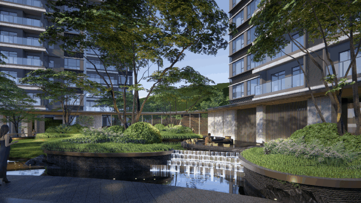 自然景观是另一个加分项。项目背靠大山乸森林公园(占地近946万平方米,在建中),西侧紧邻凤凰湖系列湖泊,包括3号湖凤举湖、5号湖凤林湖、6号湖凤采湖,推窗就能看到湖景和山体。社区内部做了约1.8万平方米的下沉式双层园林,高差近5米的水景、半天云瀑布、庭院式山水景观都搬了进来。归家动线从近50米宽的生命树迎宾大门开始,经过下沉园林、儿童乐园、登山庭院等功能分区,每一步都试图给业主带来情绪价值。很多看房者形容这里像“生长在公园里的房子”,入则宁静,出则繁华。