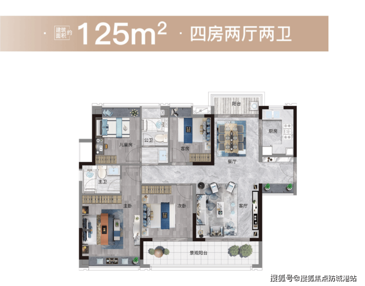 约125平四房设计,整个公区观景面更为夸张,6.7米景观阳台包裹横厅,为屋内带来通透的采光,南北双阳台设计,无论会客或就餐,一抬眼均能看到窗外的江景与园景。
