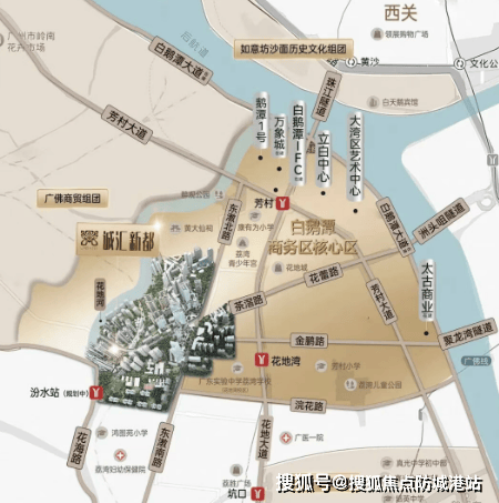 可能有人会问,诚汇新都·榕诚湾具体在哪个位置?它位于荔湾花地河以西,广州香料厂以南地段,东邻汾水花园和真光中学,西侧就是芳村的花地河。这样的位置,让它既能享受花地河的自然景观,又能近距离接触成熟社区和优质学校。如果还是没有概念,我们可以用更直观的距离来描述:项目距离花地湾地铁站约1.9公里,往西到佛山界面,直线距离大概只有1.2公里,属于广佛同城的核心衔接区域,无论是在广州荔湾、越秀上班,还是经常往返广佛两地,都十分便捷。