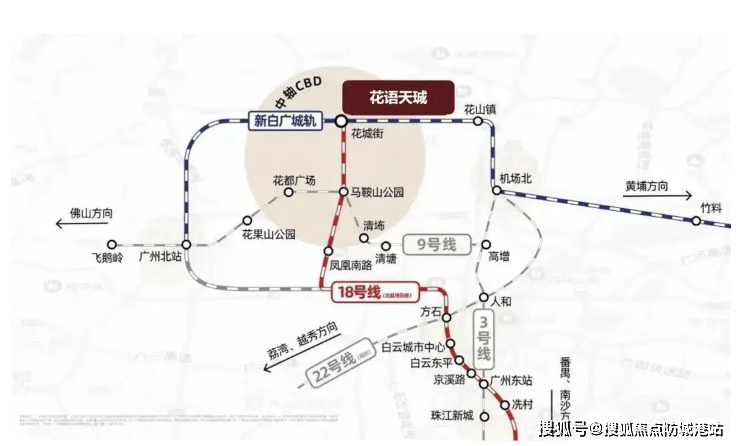 实测距离:项目距地铁18号线花城街站(在建中)仅20米,8站直达珠江新城;新白广城轨1站至广州北站,2站至白云机场。
