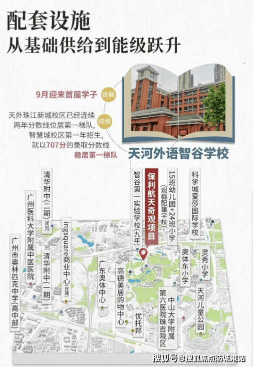 教育是项目确定性最强的优势。根据官方文件,保利辰园·湖境与缦云、越秀观樾同属黄村街道,明确对口天河外国语学校智谷校区——该教育集团为天河区属第一梯队,涵盖小学与初中,办学质量与口碑俱佳。