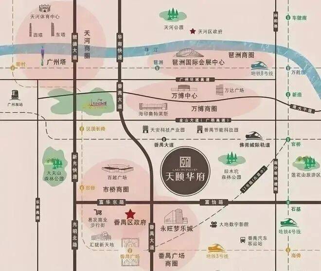 天颐华府坐落于番禺区大龙街富怡路罗家村段6号,地处番禺广场TOD枢纽核心。根据《广州市番禺区国土空间总体规划(2021-2035年)》,该区域定位为“国际科技创新枢纽+高端商务服务区”,未来将承接珠江新城、金融城的产业外溢,形成“产城融合、生态宜居”的现代化新城。