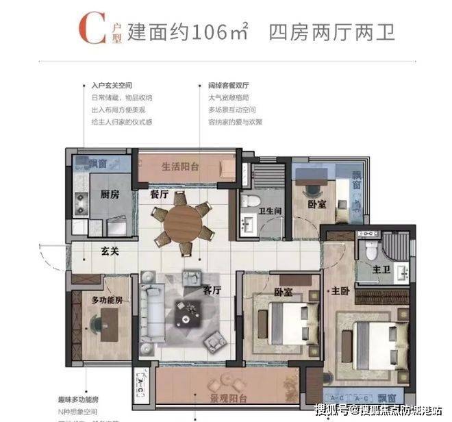 106㎡户型:高配版四房设计,满足家庭成员较多的家庭居住需求。南北对流双阳台,进一步提升通风和采光效果,使室内更加明亮通透。客厅空间开阔,与餐厅相连,形成大气的公共活动区域,适合家庭聚会和休闲娱乐。四个卧室布局合理,动静分区,互不干扰。主卧套房配备独立卫生间和衣帽间,为主人提供舒适私密的休息空间。次卧和其他房间可根据家庭成员的年龄和需求进行灵活布置,如儿童房、老人房或客房。与市场竞品 115㎡同等四房户型相比,该户型空间更大,总价 132 万起,首付 10 万,月供 5100,性价比优势明显。