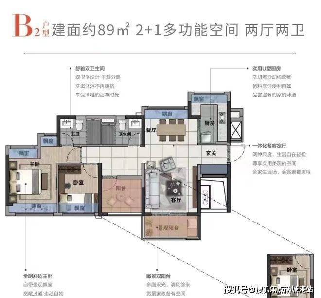 90㎡户型:为高配版三房设计,南北对流双阳台是其亮点之一。南北通透的格局使空气能够在室内自由流通,保持室内空气清新,尤其是在炎热的夏天,穿堂风可带来凉爽的感觉。客厅连接南向阳台,北向阳台与厨房相连,不仅增加了采光面,还方便日常的生活起居,如在北向阳台晾晒衣物,在南向阳台休闲观景。主卧带有独立的卫生间,保障主人的私密性。另外两个次卧空间适中,可根据家庭需求进行个性化装修,如打造儿童主题房或书房。该户型总价 110 万起,首付最低 7 万,月供 4300,对于追求舒适居住环境的小家庭来说是不错的选择。