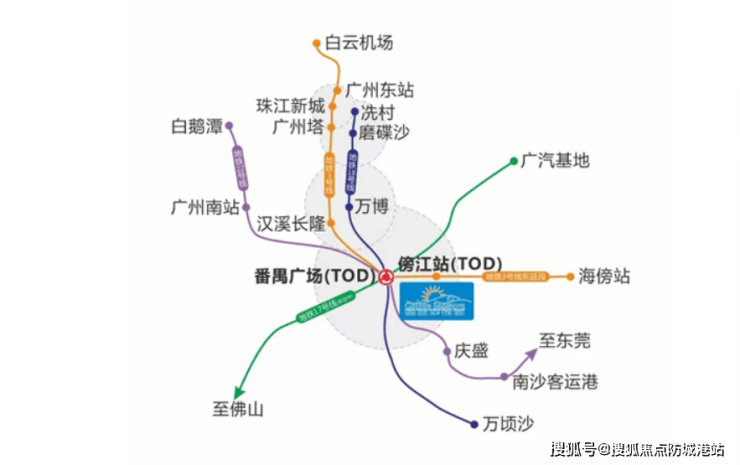 答:临近地铁 3 号线东延段傍江站,番禺广场站可换乘 18/22 号线等多条线路。