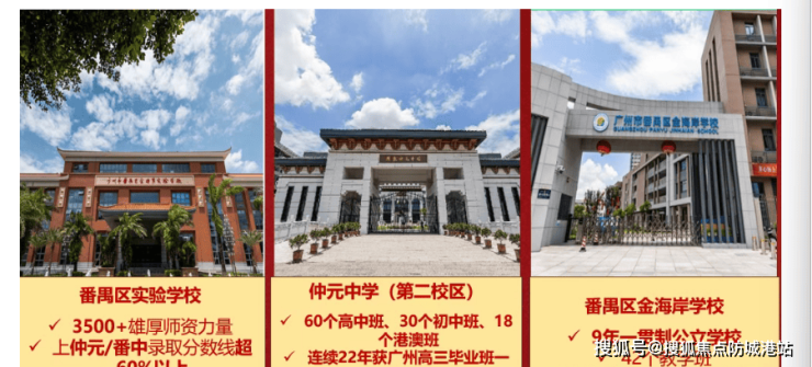 基础教育阶段,项目紧邻金海岸实验学校、金海岸学校两所九年一贯制学校,其中金海岸实验学校办学历史悠久,教学成绩常年位居番禺前列,中考表现突出,大批学生升入仲元中学等重点高中;金海岸学校为公办配套学校,硬件设施先进,师资团队由市区骨干教师、名班主任组成,教学实力强劲。