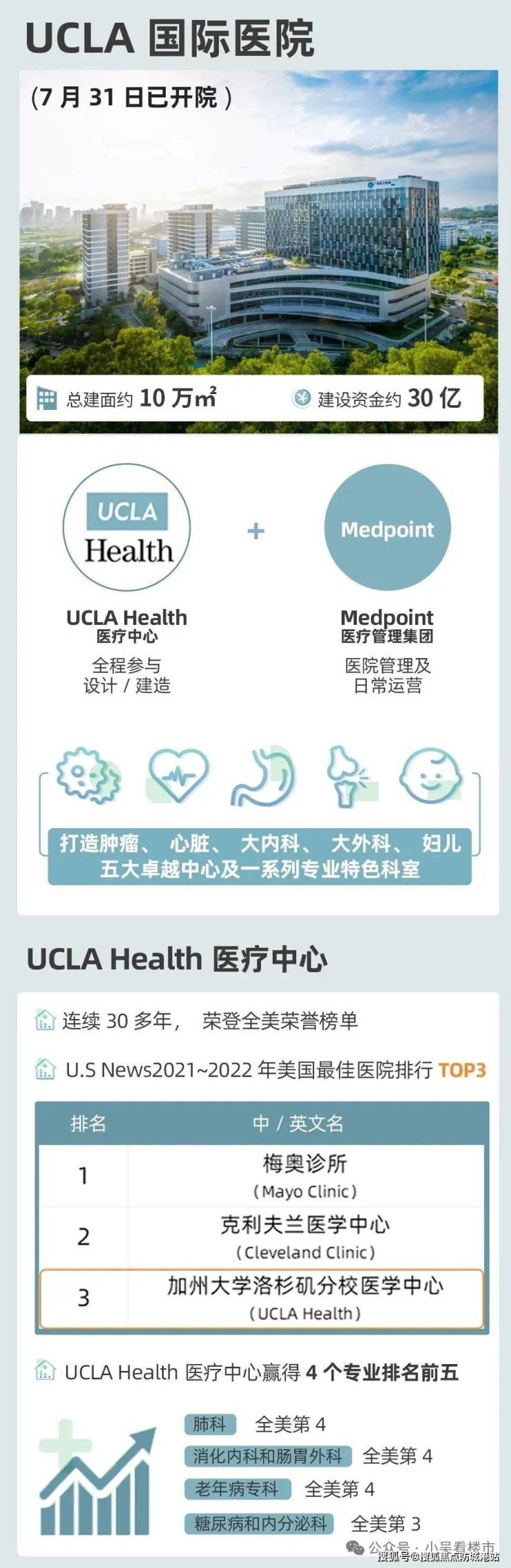 目前周边有富力UCLA Health医院,其引进了加州大学洛杉矶分销医疗中心的资源,作为“全球TOP10医疗机构”UCLA Health中国首家附属医院,投资超过30亿,打造了277间高端私人病房,提供五星级全生命周期医疗服务。