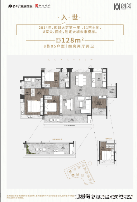 2. **128㎡四房两厅两卫**:拥有超8m阳台,连通次卧,可打造专属阳光花园。客厅开间超5m,打造1 + X空间,富有空间想象力。主卧配置270°宽敞飘窗,L形飘窗采光面宽,且飘窗近0.7m,便于打造个性化使用场景。报建花池及阳台,全屋赠送面积多,实用率高达83%。
