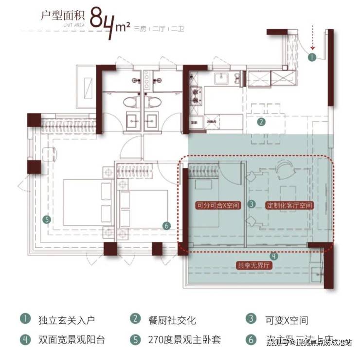 在户型设计方面,越秀珠实·皓悦滨江展现出了极高的空间优化能力,尤其是其宣称的约120%使用率,成为了该项目最具辨识度的产品标签。项目首开的1栋采用两梯五户的设计,主力户型涵盖了约84平方米的三房和约107平方米的四房。以约84平方米的三房户型为例,设计师通过精细化的尺寸控制,实现了四开间朝南的布局,这在同面积段的产品中极为罕见。该户型采用了开放式LDK(客餐厨一体化)设计,配合U型厨房,不仅提升了空间的视觉开阔感,也优化了家务动线。客厅连接着一个被称为“X空间”的灵活区域,结合5.4米的开间和双面宽阳台,使得公共活动区域显得异常宽敞通透,有效消除了小户型常见的局促感。