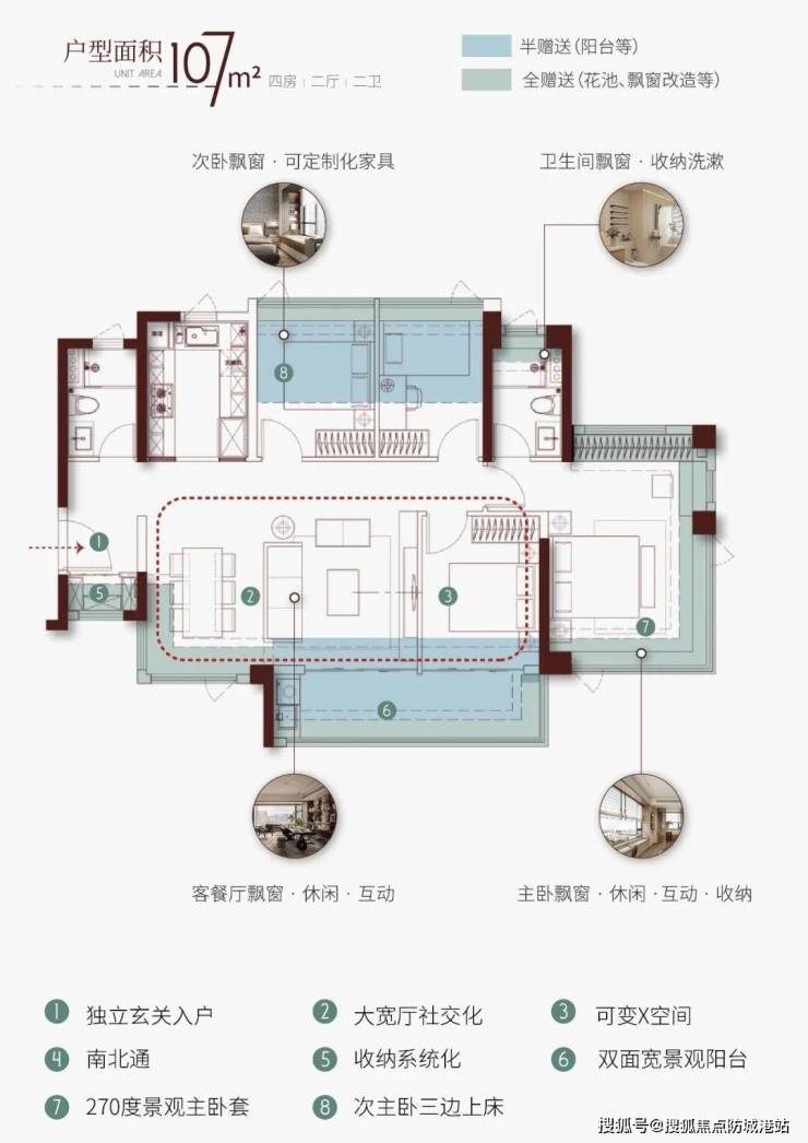 再看约107平方米的四房户型,其设计逻辑同样围绕“南向资源最大化”展开。该户型实现了4.5开间朝南,确保了全屋全天候的自然通风与采光。餐厅位于户型的中心位置,旁边同样配置了灵活的“X空间”,可根据家庭实际需求改造为书房、儿童游戏区或储物间,极大地拓展了生活场景的多样性。主卧采用了套房化设计,配备了270度的观景飘窗,不仅强化了居住的私密性与舒适感,也让主人能够在室内享受到更广阔的城市景观。全系产品均采用全南向布局,并巧妙利用西北或东北向的视角来拓展江景视野。这种设计策略,实际上是在有限的物理空间内,通过科学的功能复合与动线重组,实现了居住舒适度的最大化。对于需要兼顾老人、小孩三代同堂的家庭,或是追求高品质独居生活的年轻人,这种高得房率、功能完备的户型设计,提供了极具吸引力的解决方案。