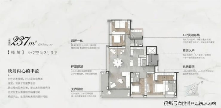 中海天幕湾主打大平层户型,提供约180/237㎡的宽敞空间,旨在全面升维空间的尺度感与居住的舒适度。每户住宅都经过精心设计,确保每个房间都有良好的采光和通风条件。开放式厨房、豪华浴室以及宽敞的客厅和卧室,无不彰显着项目的高端定位。大平层的设计理念使得家庭成员之间的互动更加频繁,同时也保证了个人隐私。