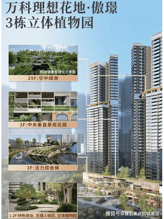 项目由品牌房企万科开发,依托万科多年造城经验,品质与交付更有保障。总建筑面积约 16 万㎡,规划 4 栋住宅共 844 套房源,总层高 4-44 层,梯户比为 2 梯 5-6 户(低区 4-28 层 2 梯 6 户,高区 30-44 层 2 梯 5 户),保障居住舒适度。项目最大亮点是打造广州首座立体植物园住宅区,外立面采用现代玻璃幕墙设计,1-2 层规划商业街区与立体植物园,3 层设体育会所(含篮球场、泳池等),30 层打造空中会所,通过垂直绿化与分层功能布局,解决老城区土地资源有限的痛点,提升居住品质。