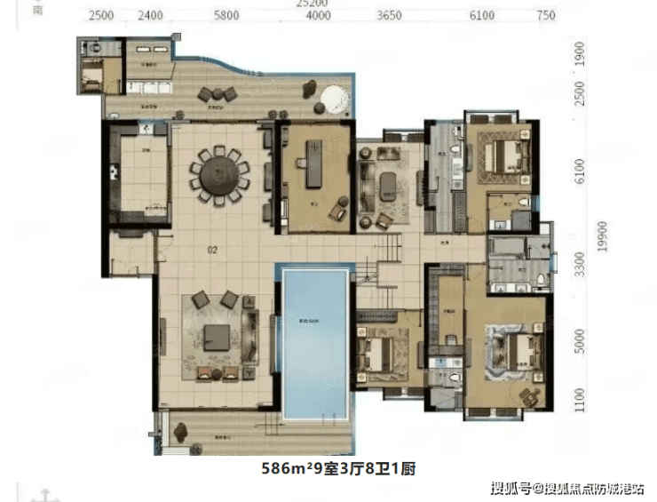 586㎡ 空中泳池复式(9 室 3 厅 8 卫):顶层复式楼王,9 房 3 厅 8 卫超奢配置,双层挑高客厅,双空中泳池设计。每层均有独立起居空间,功能分区明确,可满足家族聚居、多代同堂或私人社交的顶级需求。