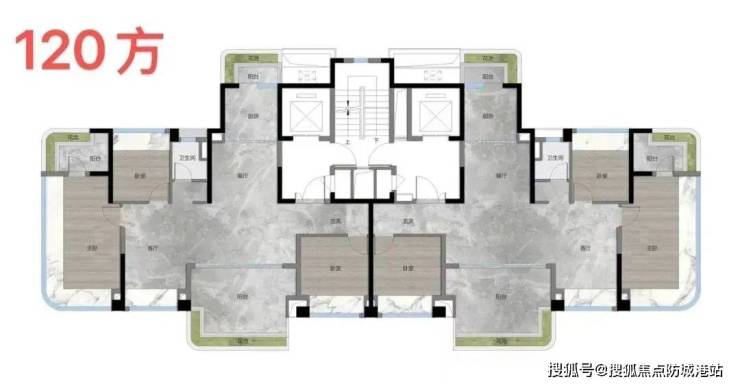 建面 120㎡的四房两卫,双阳台搭配超宽客厅,主卧 L 型飘窗,2梯2户,独立梯厅空间,南北对流双阳台,4.9 米面宽大客厅,1.8×5 米阳台,宽敞明亮,舒适度极高。