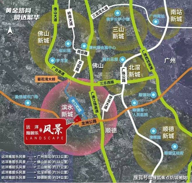 佛山远洋雅居乐风景交通十分便捷,拥有完善的交通网络。菊花湾大桥北起北滘、南连勒流,通过这座桥,约 25 分钟就能速达世纪莲体育中心,约 28 分钟可畅达罗浮宫家具中心,方便居民前往佛山重要的体育、商业场所。龙洲公路更是项目交通的重要依托,它串联顺德东西两翼走向,并与广佛江珠高速、G105 广佛公路等 9 大高速主干道相连。约 20 分钟即达顺德大良,约 20 分钟可畅达顺德轻轨站,约 30 分钟就能直达广州南站。无论是日常通勤到顺德的主要城区,还是乘坐轻轨、高铁出行,都非常便利,轻松实现广佛同城生活,畅享大湾区交通红利。