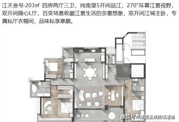 室内配置同样毫不妥协:全屋精装修交付,标配美国百朗双向流新风系统,PM2.5净化效率高达99%,构建健康呼吸屏障;电梯独立入户,保障私密与尊崇;层高达3.3米,配合方正通透的格局与动静分区设计,让每一寸空间都高效服务于生活本质。205㎡“江天叁号”更以双开间随心L厅打破传统客厅边界,灵活适配会客、阅读、亲子等多种场景,其创新布局已被多个后续高端项目借鉴,足见其前瞻性。