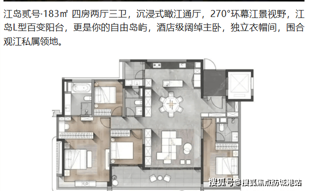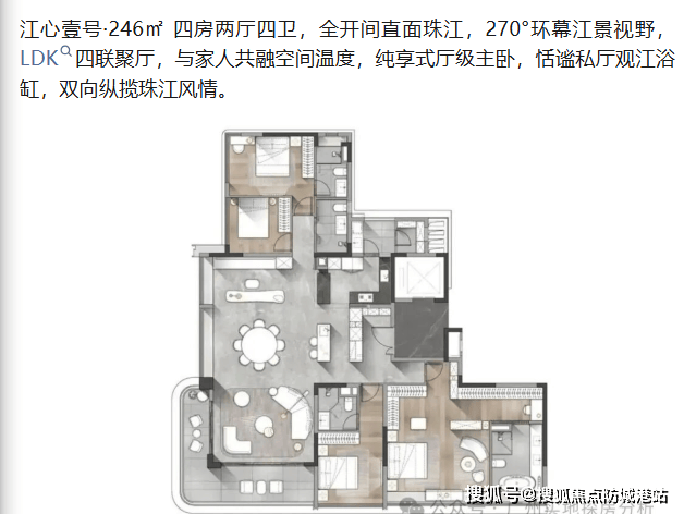 尤其值得一提的是,246㎡“江心壹号”户型首创LDK四联聚厅设计——客厅、餐厅、厨房与观景阳台无缝贯通,形成超60㎡的家庭互动核心区,既满足多代同堂的亲密交流,又不失空间的通透与秩序。而183㎡“江岛贰号”则以L型百变阳台打造私人岛屿式观景平台,270°环幕视野将珠江四江交汇、双岛点缀的壮阔画卷尽收眼底。