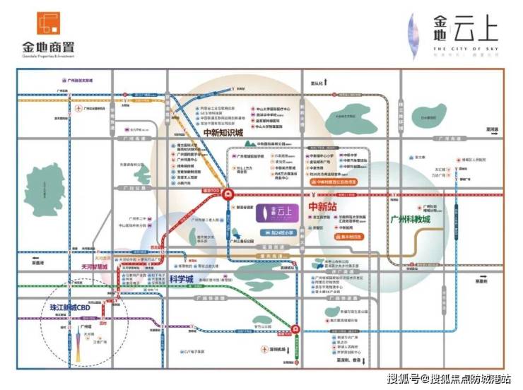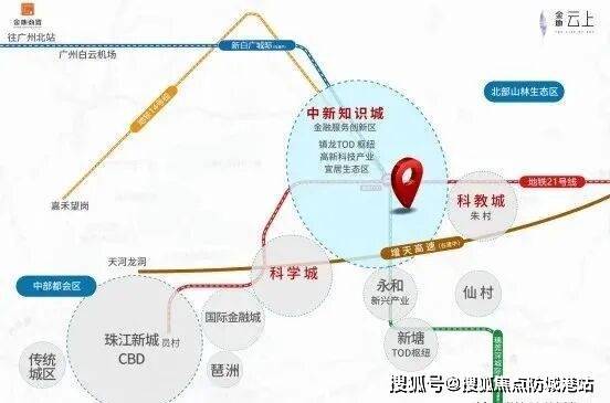金地云上位于增城中新板块,离项目最近的地铁站是21号线中新站,从中新地铁站出发,中新-镇龙(换乘快线)-苏元-大观南路,3个站可到达天河。