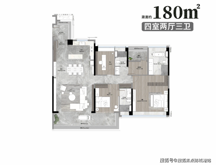 户型设计优质 适配改善需求:项目在售户型为 105-180㎡3/4 居室,主力户型为 125-180㎡南向宽幕豪宅,户型使用率超 100%,符合广州 2026 年新规产品标准,南北通透、户型方正,配备宽景阳台、主卧套间等设计,满足刚需及改善型购房者的居住需求,总价 800 万元起,为天河芯高性价比改善户型。