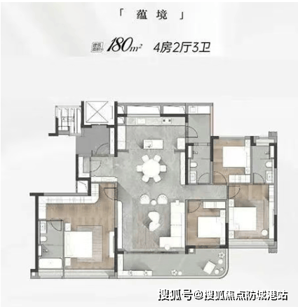 180㎡户型:南北通透、方正户型,LDKG客餐厨阳台一体化设计,实现家庭共融。