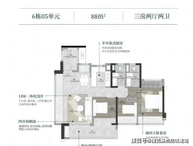 所有户型均采用T5风车型全南向布局,确保主要生活空间朝南采光,通风效果优异。尤为值得一提的是,项目在阳台尺度上大胆创新:88㎡户型阳台开间约6.2米,105㎡户型约6.5米,125㎡户型更达8.3米,不仅拓展了生活场景,更将自然光线与江景视野最大限度引入室内。此外,每户均配置入户花园,各卧室均设超大飘窗,细节之处尽显人性化考量。
