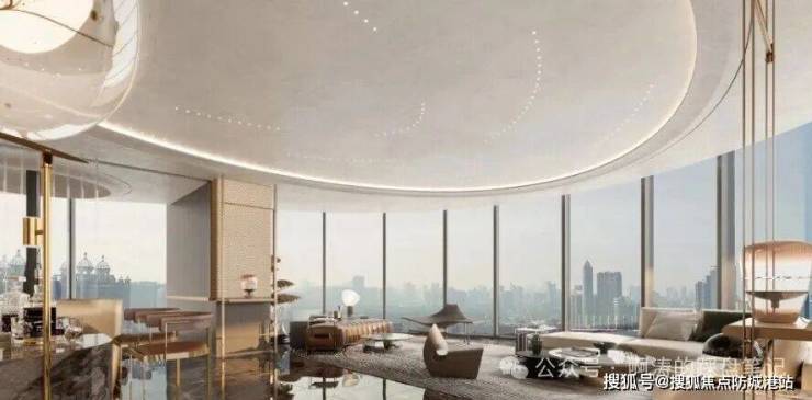 建筑设计:由执笔纽约220 Central Park South的全球顶级建筑事务所Robert A.M. Stern Architects (RAMSA) 与鹏瑞长期合作伙伴奥雅纳联合打造。标志性的弧形玻璃幕墙与竖向金属线条,不仅源于对珠江风环境的流体动力学模拟,更塑造了金融城东区最具辨识度的天际线。建筑全部采用圆柱体组合,最大化每户的景观面与采光,此设计在全球顶级公寓中亦属罕见。