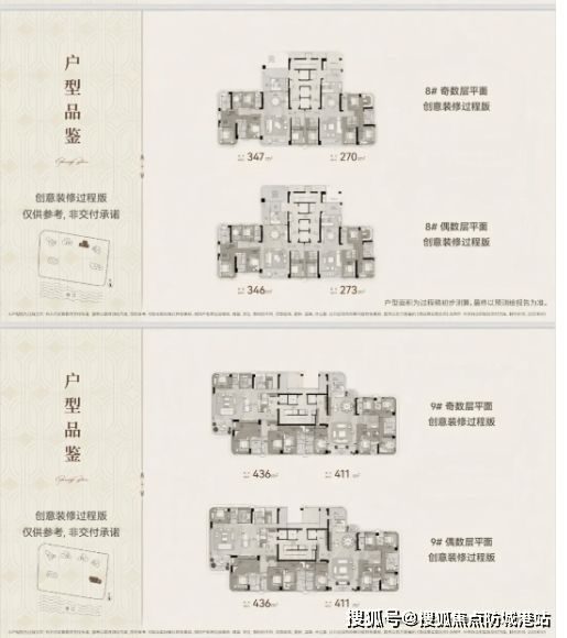 其他楼栋中,6 栋和 8 栋为 48 层高,3 梯 2 户设计,主打 277、348 平大平层产品;5 栋 50 层高,3 梯 2 户配置,面积 241 平;9 栋 37 层高,2 梯 2 户,规划 408、435 平户型;1 栋作为楼王,35 层高且一层一户,面积达 630 平。