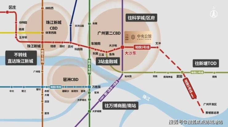 保利·招商·华发中央公馆的交通优势明显。距离地铁5号线大沙东站仅550米,3站可达天河金融城,10站约26分钟直达珠江新城无需换乘。同时,它也是7号线的大沙东站,坐地铁3站到黄埔科学城,7站到番禺万博,半小时内畅达广州各大CBD如珠江新城CBD、琶洲CBD、万博CBD。自驾出行方面,通过黄埔大道、中山大道等主干道,可快速到达金融城核心及琶洲CBD,极大地提升了居住者的生活便利性。