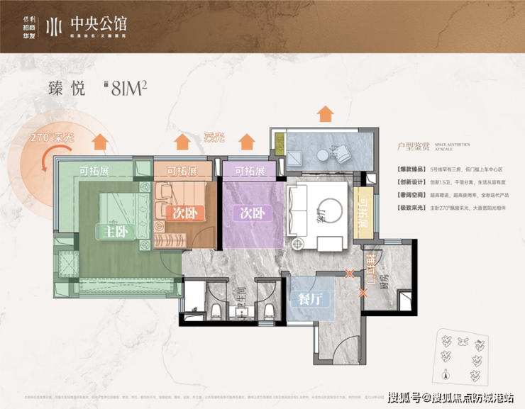 保利·招商·华发中央公馆推出的户型涵盖建面约81-159㎡的三至四房产品,使用率高,空间布局合理。例如,建面约81㎡的2+1房户型采用灵活多变设计,将厨房、餐厅和客厅的空间连通,整个空间布局比较合理,使用率达到105%;建面约116㎡的四房户型则实现了入户花园、客餐厨、阳台灵活拓展成一个超级大方厅,约6米的大阳台拓宽了生活的尺度。每一种户型都体现了开发商对居住品质的不懈追求。