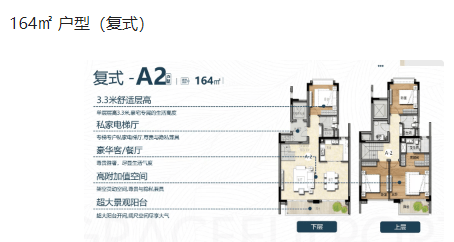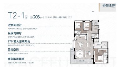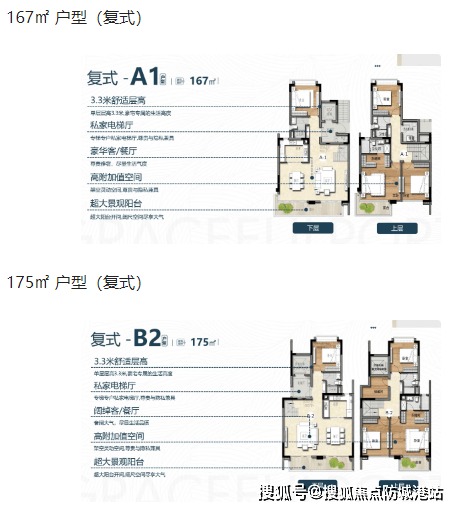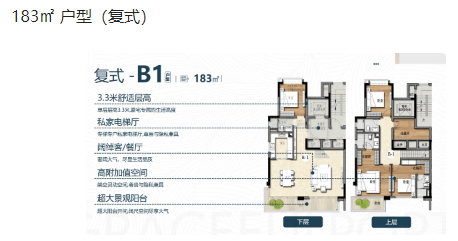 203㎡三房+1书房+1间两厅三卫 此外,还有复式户型可供选择,如164㎡、167㎡、175㎡和183㎡,以满足不同客户的个性化需求。