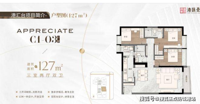 127㎡三房两厅两卫:三开间朝阳,确保了采光和景观无遮挡。LDK 一体的开放互动设计,释放出更大的活动空间,让家庭成员之间的交流更加便捷。双阳台设计,为生活增添了一份诗意,可一边享受阳光,一边欣赏城市或江景。