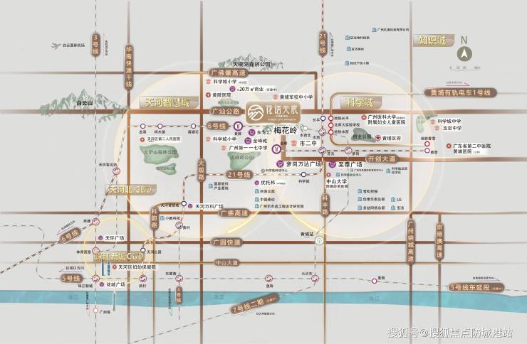 在广州城市东进的宏大叙事中,天河智慧城与黄埔科学城的交汇处始终是广州第三中轴(科技创新轴)的黄金节点。作为双央企——世界500强中国铁建与信达地产的联袂钜作,【花语天宸】以约16万平方米的精致体量,屹立于梅花岭的苍翠林海之下。项目占据天河智慧城核心腹地,既承接了金融城与珠江新城的外溢红利,又坐拥科学城的产业势能,是广州主城区罕见的低密山居大城。