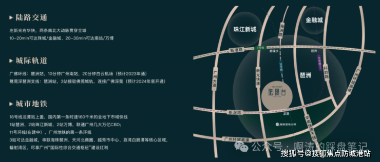 项目的交通配套是最大的优势,真正的双地铁上盖物业,楼下就是11号线与18号线的龙潭站,真正的下楼就能进地铁,不用风吹日晒,下雨的时候您不用打伞就能从家走到地铁站,非常方便。18号线是国内第一条时速达160公里的全地下市域快线,从项目出发,1站就能到琶洲,2站就能到珠江新城,就算您在珠城上班,通勤也只需要15分钟,比您住在珠城周边还要方便,而且这条线路未来还会连接广州东站,快速通达湾区其他城市。11号线是广州的首条地铁环线,共设32座车站,其中26座是换乘站,串联了市中心的五个核心区,从项目出发,3站就能到金融城,不管您在广州哪个核心区上班,都能快速到达。自驾的话,项目旁边就是新滘中路快速路,连接新光快速、华南快速等城市主干道,15分钟就能到珠江新城,20分钟就能到番禺万博,30分钟就能到白云机场,不管是日常通勤还是周末出游,都非常便捷。周边还有多条公交线路,覆盖了海珠、天河、番禺等多个区域,公共出行的选择非常多,真正实现了全城速达。