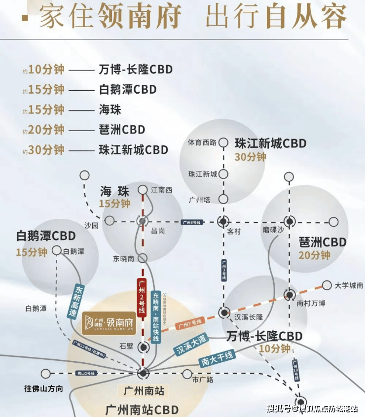 岭南府位于广州南站核心区,区位优势明显。广州南站是亚洲客流量第一的交通枢纽,拥有4条高铁线路、3条城际轨道、4条地铁,可实现1小时通达粤港澳大湾区主要城市。随着广州南站的不断发展和完善,其周边的商业、产业等配套也在不断升级。岭南府距2/7号线石壁站仅约300米,通过地铁可快速到达广州足球公园、长隆欢乐世界、万博商圈等热门区域,同时也可直达珠金琶、白鹅潭、海珠等地。此外,项目周边还有多个商业综合体在建,如约92万㎡新鸿基TOD综合体、合生创展合生汇综合体等,未来商业氛围将更加浓厚。随着南站板块的不断发展,岭南府的资产增值潜力巨大。