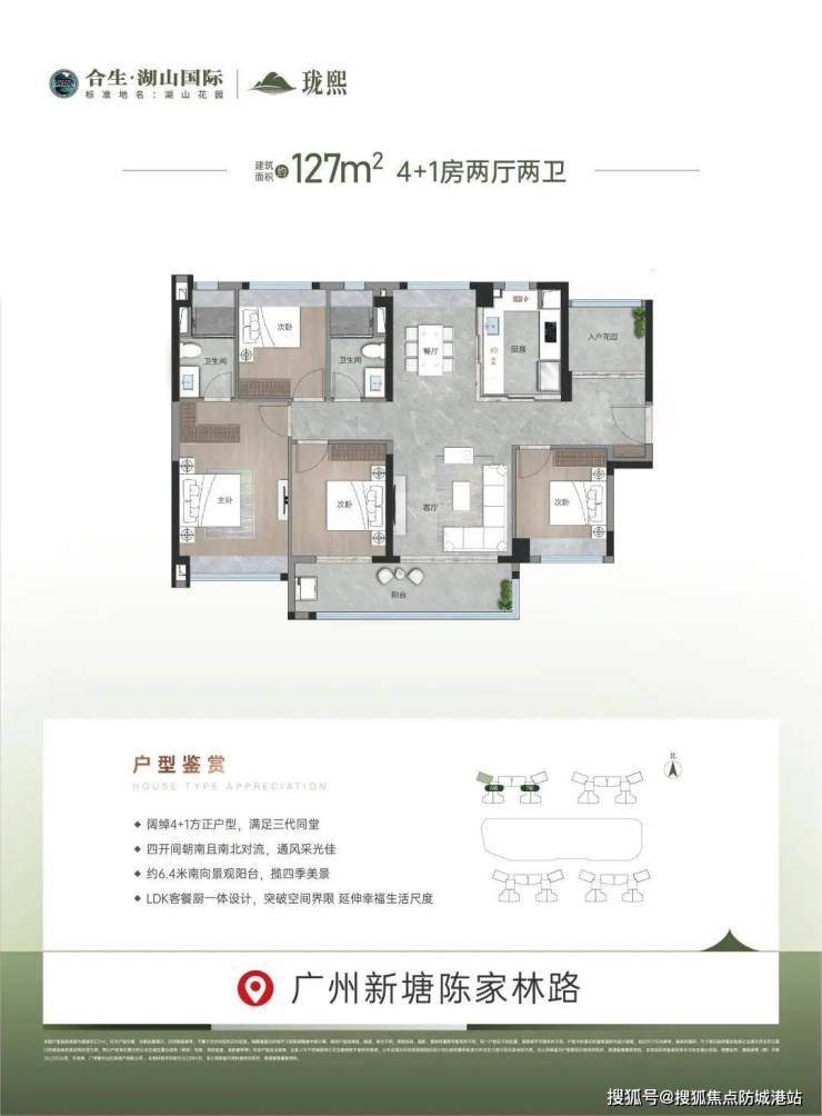 亮点:格局通透,全明采光,双卫起居从容有致,约6.4米南向景观阳台,坐拥四季风光。