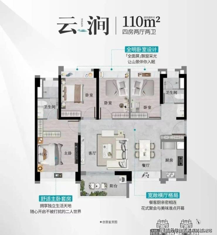 110㎡四房两卫:南北对流双套房,尊享户型,总价380万起。