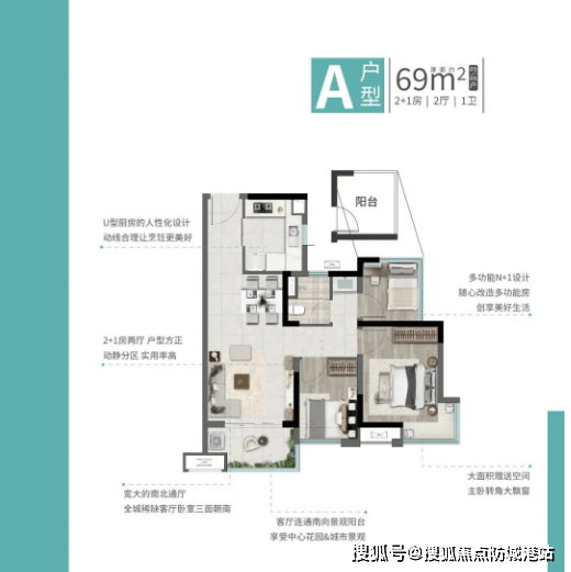 69㎡ 2+1房2厅1卫,是项目的刚需爆款户型,户型方正,动静分区,实用率高,宽大的南北通厅,全城稀缺客厅卧室三面朝南,采光通风俱佳,客厅连通南向景观阳台,可享受中心花园&城市景观,U型厨房的人性化设计,动线合理让烹饪更美好,大面积赠送空间,主卧转角大飘窗,多功能N+1设计,随心改造多功能房,创享美好生活,适合新婚夫妻或单身贵族居住。