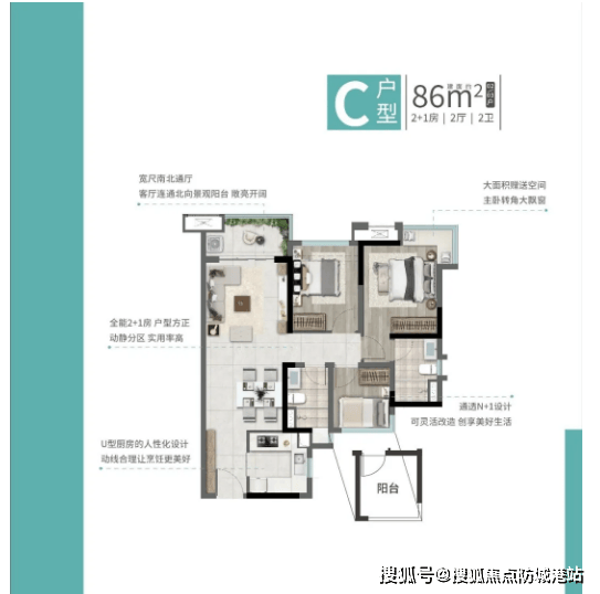 86㎡ 2+1房2厅2卫,全能户型,户型方正,动静分区,实用率高,宽尺南北通厅,客厅连通北向景观阳台,敞亮开阔,U型厨房的人性化设计,动线合理让烹饪更美好,大面积赠送空间,主次转角大飘窗,通透N+1设计,可灵活改造,创享美好生活,双卫生间设计,满足多人口家庭的日常使用需求,避免早晚高峰期排队使用卫生间的尴尬,适合改善型三口之家居住。
