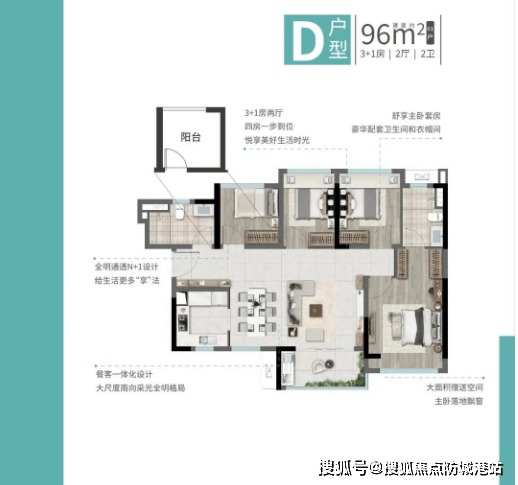 96㎡ 3+1房2厅2卫,全能大四房,户型方正,动静分区,实用率高,宽尺南北通厅,客厅连通北向景观阳台,敞亮开阔,U型厨房的人性化设计,动线合理让烹饪更美好,大面积赠送空间,主次转角大飘窗,通透N+1设计,可灵活改造,创享美好生活,四个房间的设计,可满足三代同堂的居住需求,每个家庭成员都能拥有独立的居住空间,隐私性强,适合改善型家庭居住。