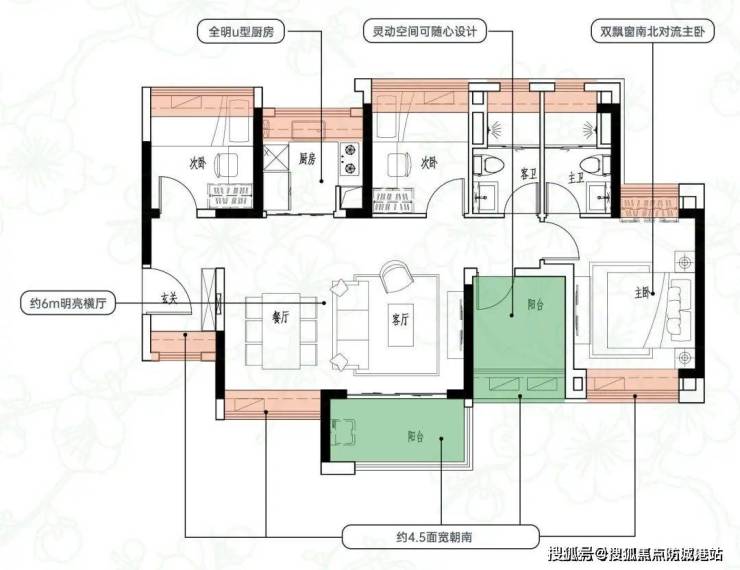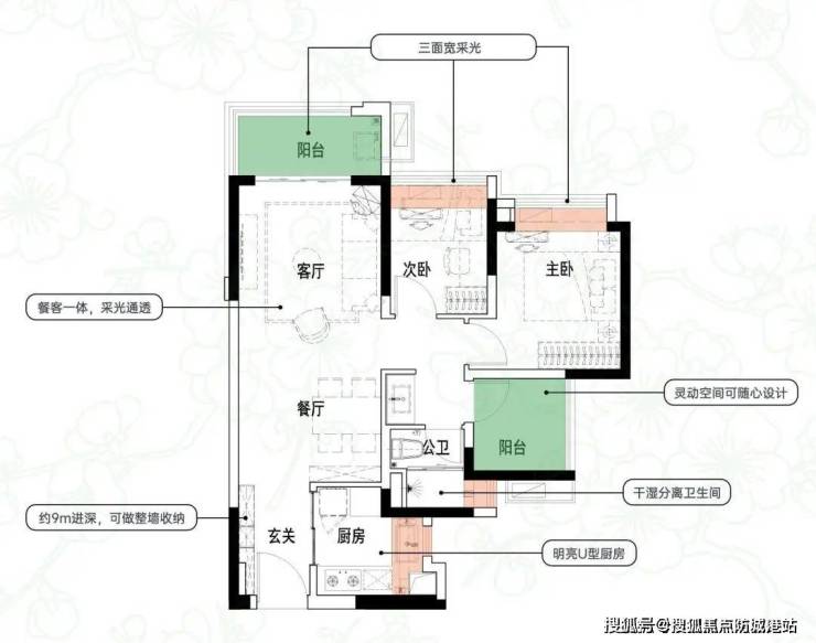 98㎡四空间两厅两卫:横厅设计,四开间朝南,所有卧室均为全飘窗设计,最大化争取通风采光面,可拓展空间满足家庭成长需求。
