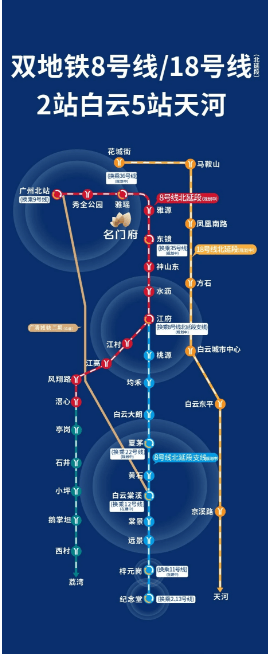 项目地理位置优越,距离地铁8号线北延段雅源站(在建)仅约500米,未来可通过便捷换乘速达荔湾、越秀两区;距18号线北延段凤凰南路站约2公里,预计2026年试运营,五站直达天河。门前广花快速路主线全线通车,双向8-10车道,全程无红灯,实现中心城区半小时生活圈。
