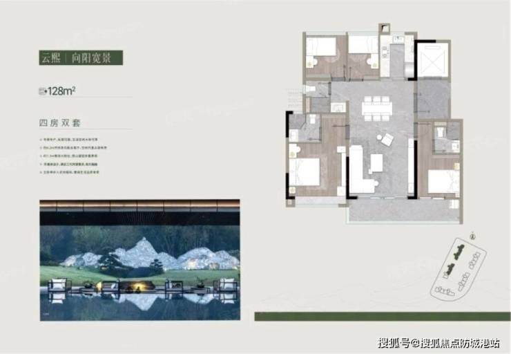 首先是128㎡的四房两厅三卫户型,主要集中在1-3栋的5-18层,总价约576万起。这款户型南向面宽达11.2米,客厅连接着6.8米长的观景阳台,采光通风极佳。主卧带独立卫浴和飘窗台,两个次卧面积均在10㎡以上,空间宽敞舒适。这款户型非常适合三口之家或刚步入改善阶段的年轻家庭,既满足了功能需求,又控制了总价预算,性价比极高。
