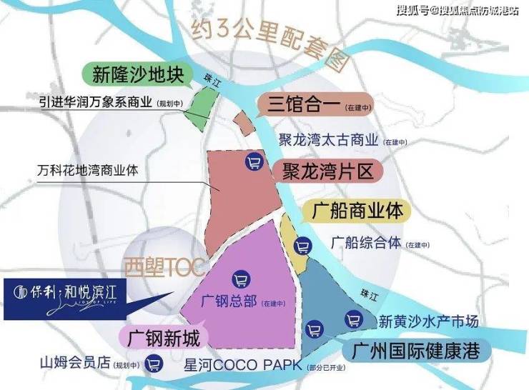 往大了说,处于白鹅湾商圈辐射区;往小了说,位于广钢新城板块西侧,周边是海龙科创起步区,坐落于西塱TOC辐射范围内。