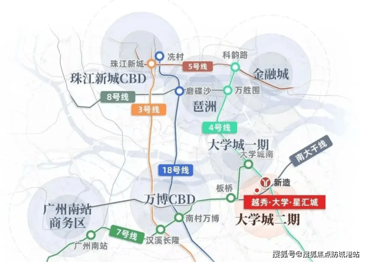 项目周边规划有 3 条地铁线路,构建高效通勤网络。其中地铁 4 号线新造站直线距离 1.2 公里,7 站直达琶洲 CBD,9 站抵达珠江新城,早高峰地铁通勤时间仅 35 分钟;规划中的地铁 7 号线板桥站直线距离 800 米,预计 2027 年通车后,3 站直达万博 CBD,通勤时间缩短至 15 分钟;此外,地铁 12 号线延长线(规划中)将在项目附近设站,未来可直达广州南站,实现 1 小时湾区通勤圈。