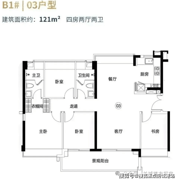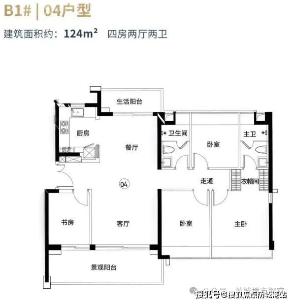124平方米四房户型:121平方米的PLUS版本,整体格局相似,但在餐厅北侧多了一个生活阳台,景观阳台连接到书房位置。