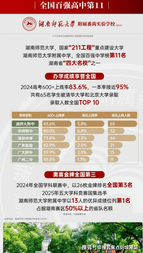湖南师大附中实力雄厚,在全国百强中学中排名第 11 名,拥有 37 名特级教师、26 人奥赛金牌教练团队,被誉为 “院士摇篮”,培养出黎氏三兄弟院士、嫦娥工程首席顾问张履谦等顶尖人才。如此强大的师资力量和教学底蕴,将为孩子们提供高质量的教育。